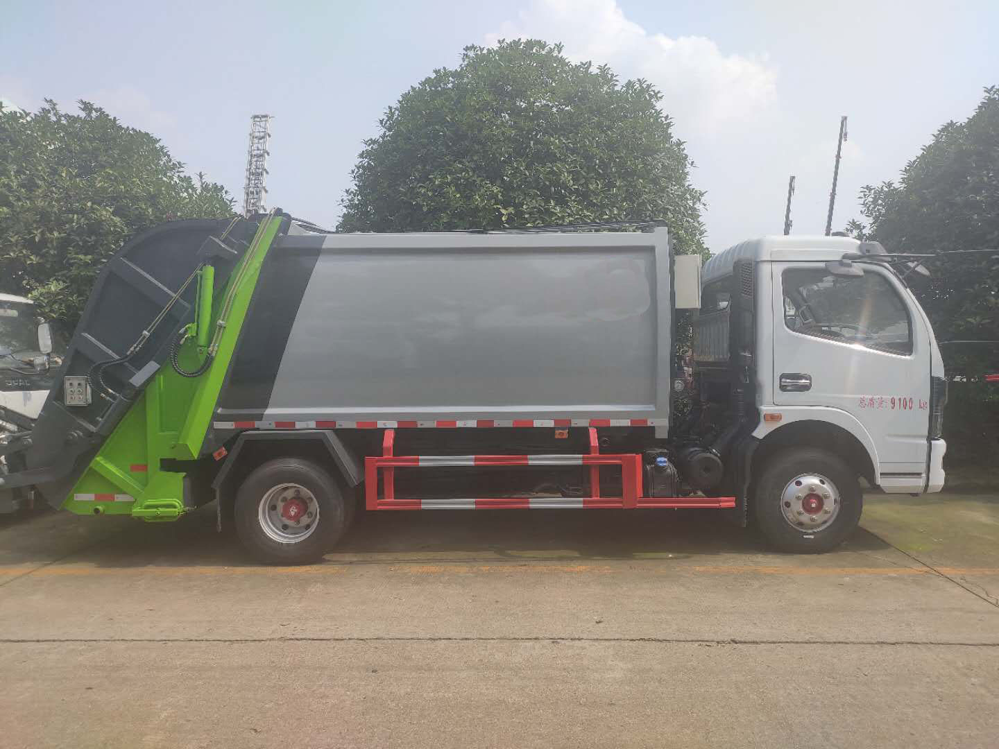 ④ 密封处理消除二次污染 垃圾在压缩装填和运输过程中处于封闭状态。垃圾箱与填装器接合面装有特制的橡胶密封条,采用锁紧装置压缩密封;污水箱上安装有独特的排污阀,密封可靠,不易堵塞。填装器盖选装完全遮盖住填装器投料口,消除转运过程车尾气流扰动造成垃圾尘屑飞扬的现象,外观更加美观。